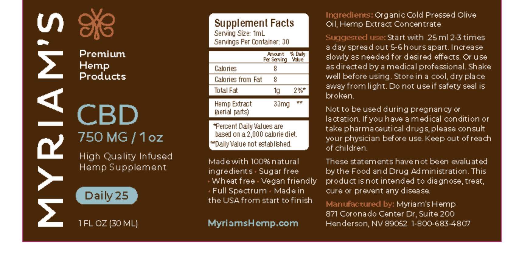 Myriam’s proprietary Daily 25 CBD blend contains 750+ mg full-spectrum CBD per fluid ounce and other beneficial and therapeutic phytocannabinoids, terpenes and flavonoids. This high quality CBD contains Myriam’s lowest concentration of CBD per serving and is to be taken orally by placing it on the tongue, as instructed on the label. When administered orally, CBD can take effect quickly.